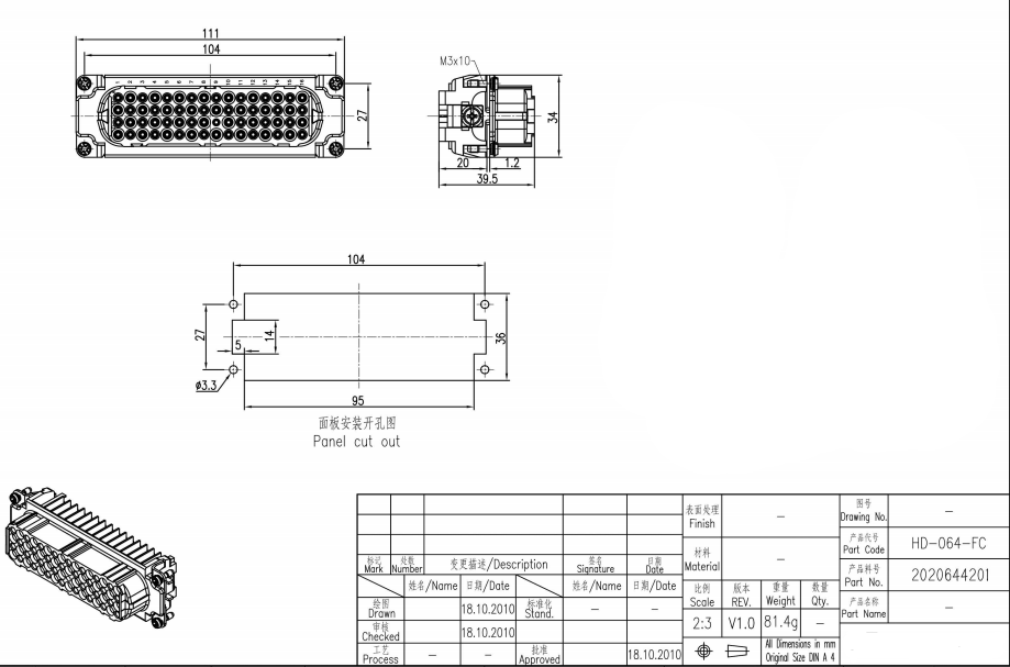 | 接插件针数 | 64+PE |